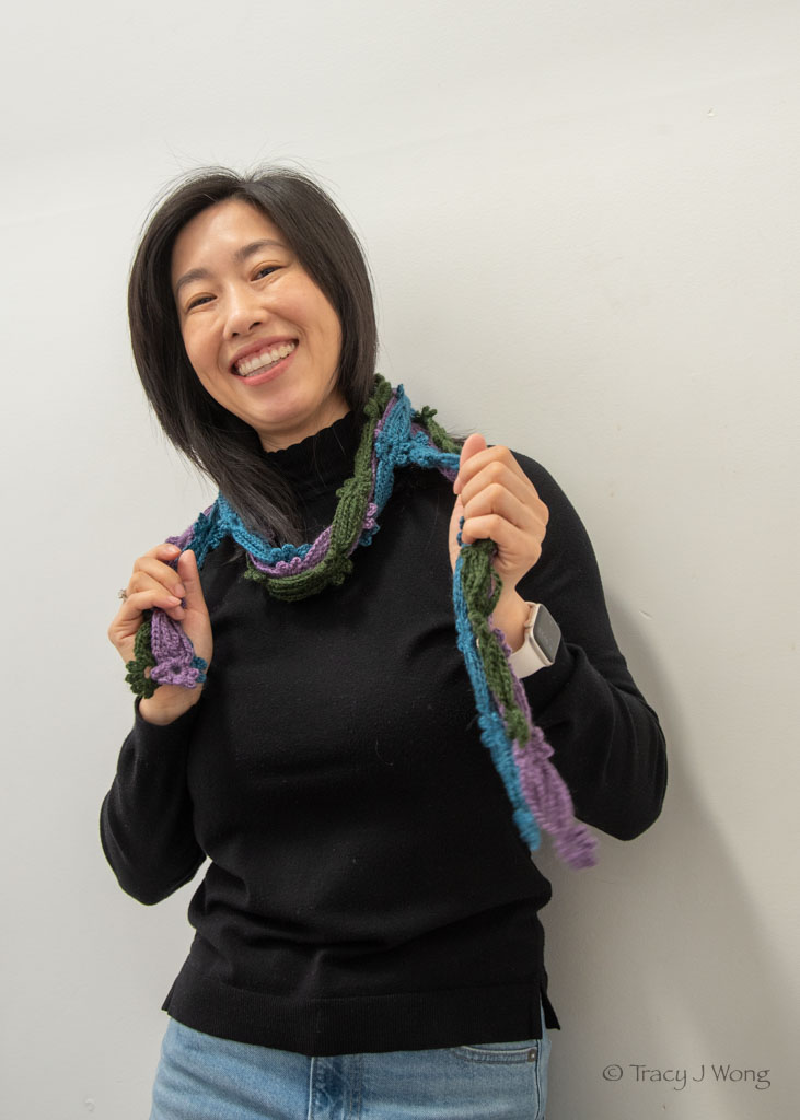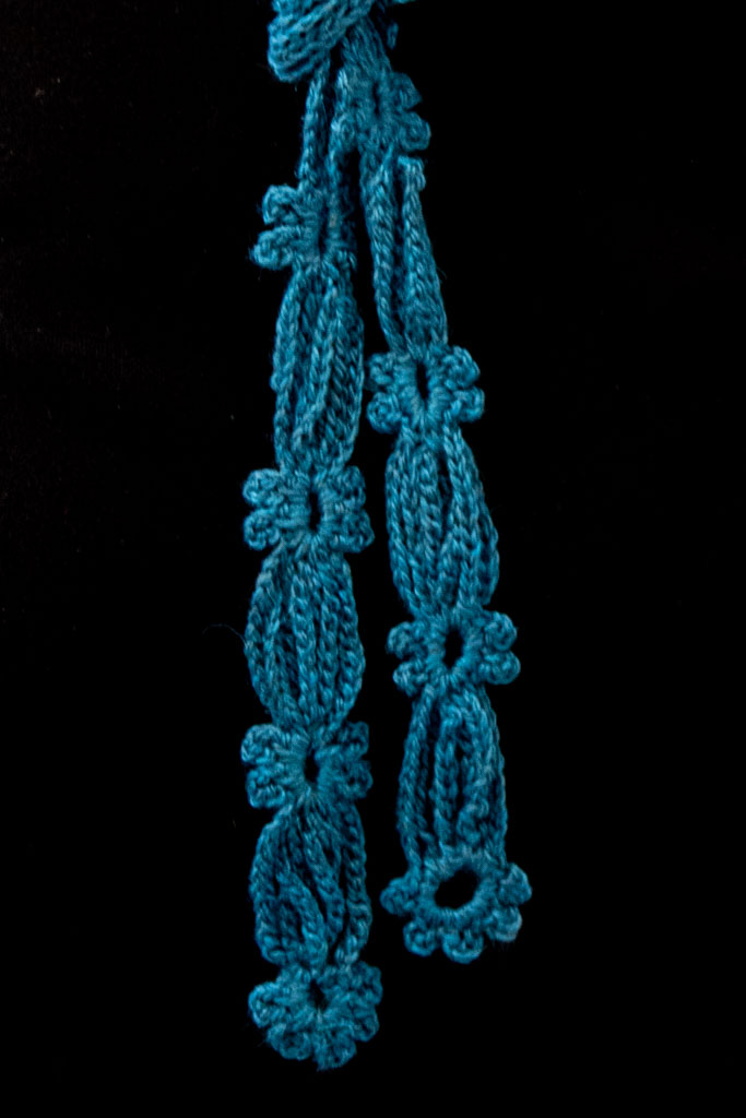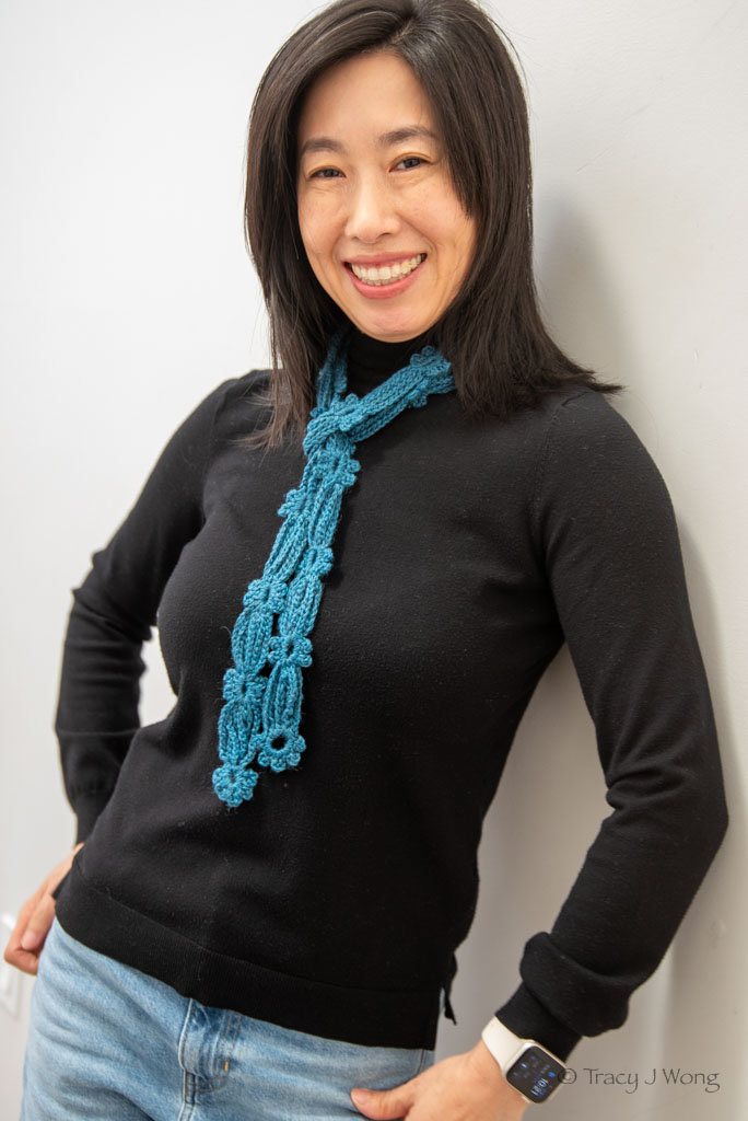Mrs. Micawber, also known as Sue Perez, designed this skinny crochet scarf. I was charmed by the delicate design with its hint of spring. As Sue Perez described in Mr. Micawber’s Recipe for Success, “Its twisting chains remind me of green beans clustered on the vine, and the flowers interspersed are of course the bean blossoms.”