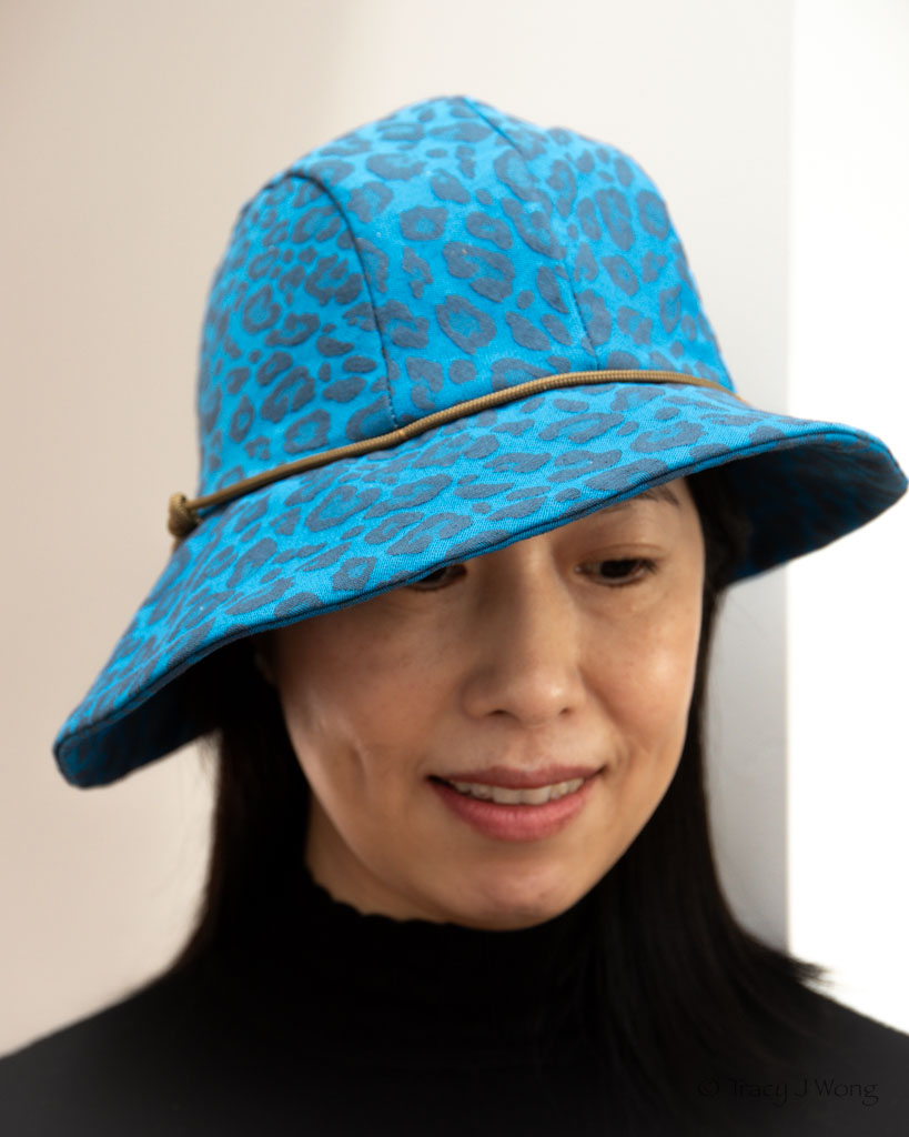 For something more avant garde, try this hat made from the same pattern in a blue leopard print. The fabric is a warp stretch cotton (73% Cotton, 23% Polyester, 4% Spandex). Being mid-weight and sandwiching a substantial layer of interfacing helps to hold the “crisp” hat shape. I knotted a length of paracord to finish the hat.