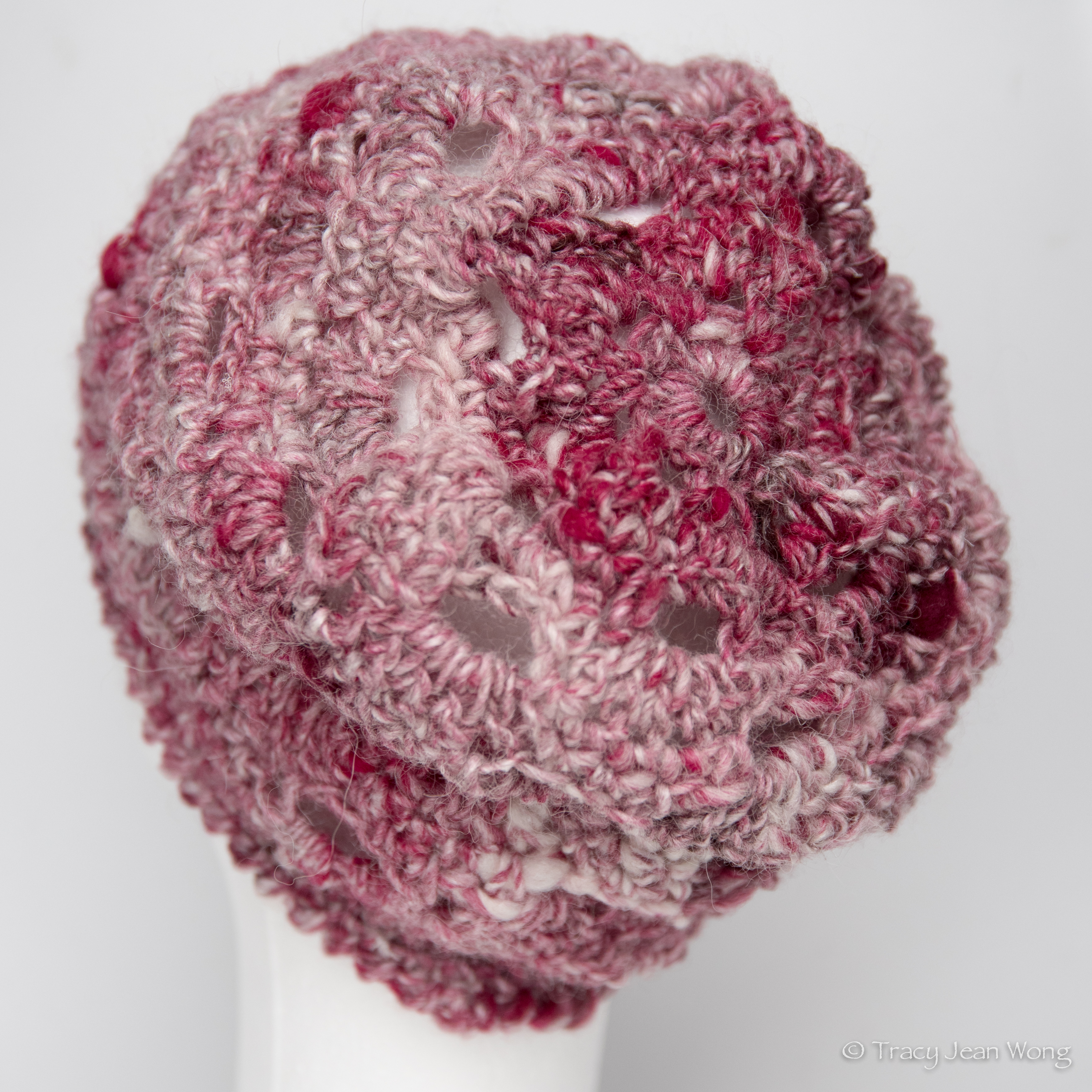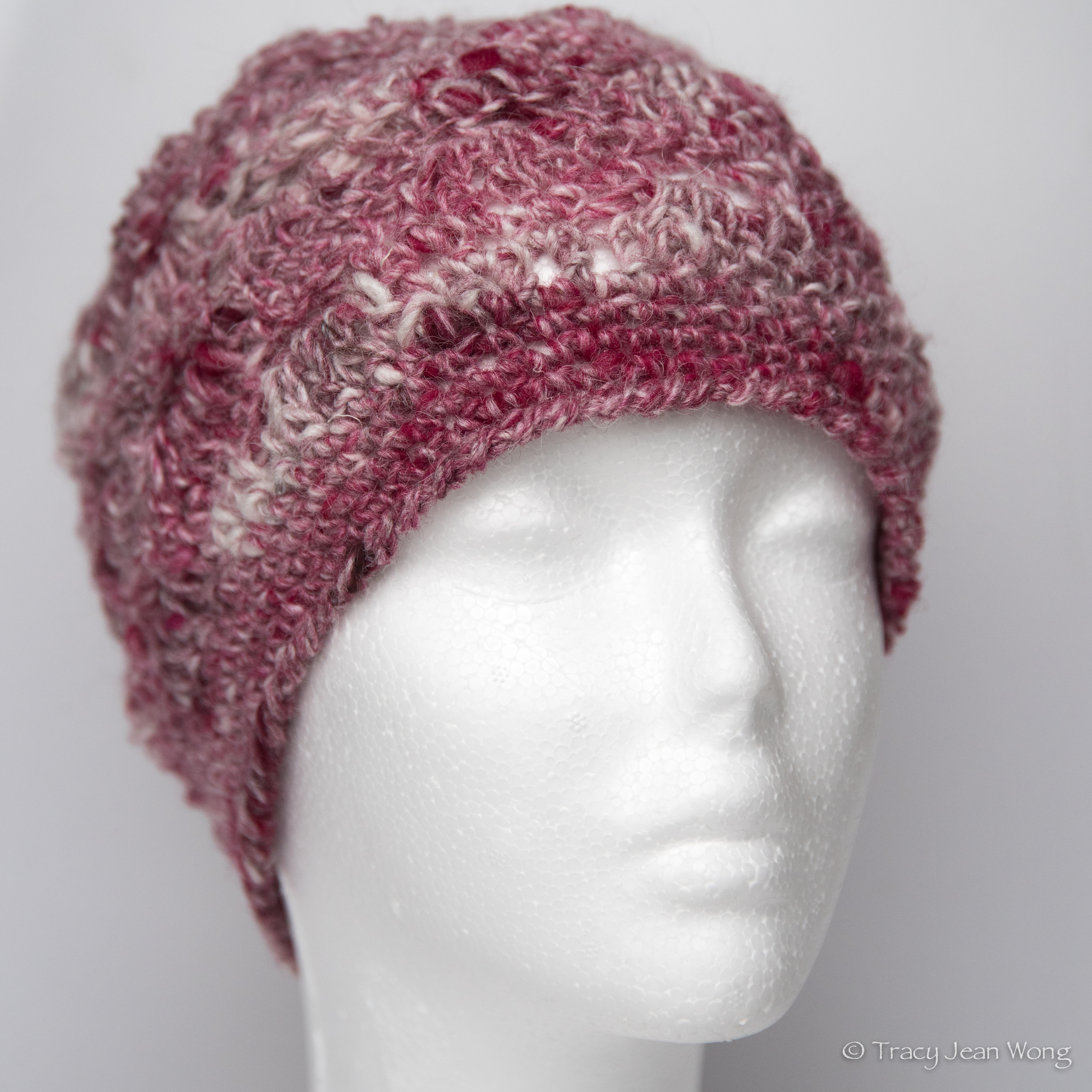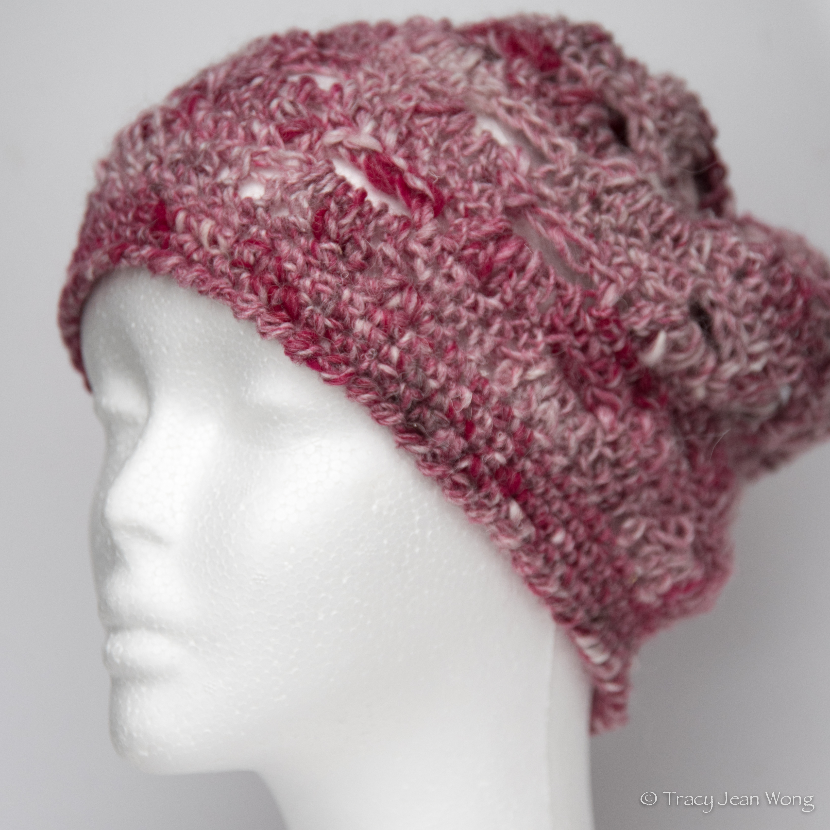 This month of Valentine’s Day, let’s consider some other colours. The vibrant colour of red will most certainly draw attention and it is a colour of energy, passion, and power. Bright pink is often thought as a little girl’s colour, but different shades of pink can be flirty, romantic, or calming. Below, the “Summer Slouch Beanie”, a pattern designed by Simply Made by Erin, shows variegated pinks in a mix of wool, silk, and alpaca.
