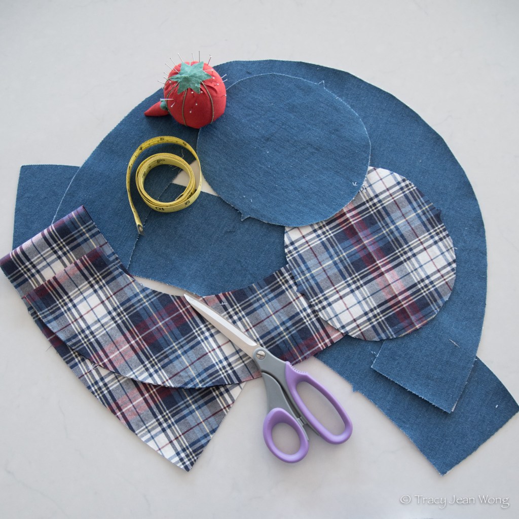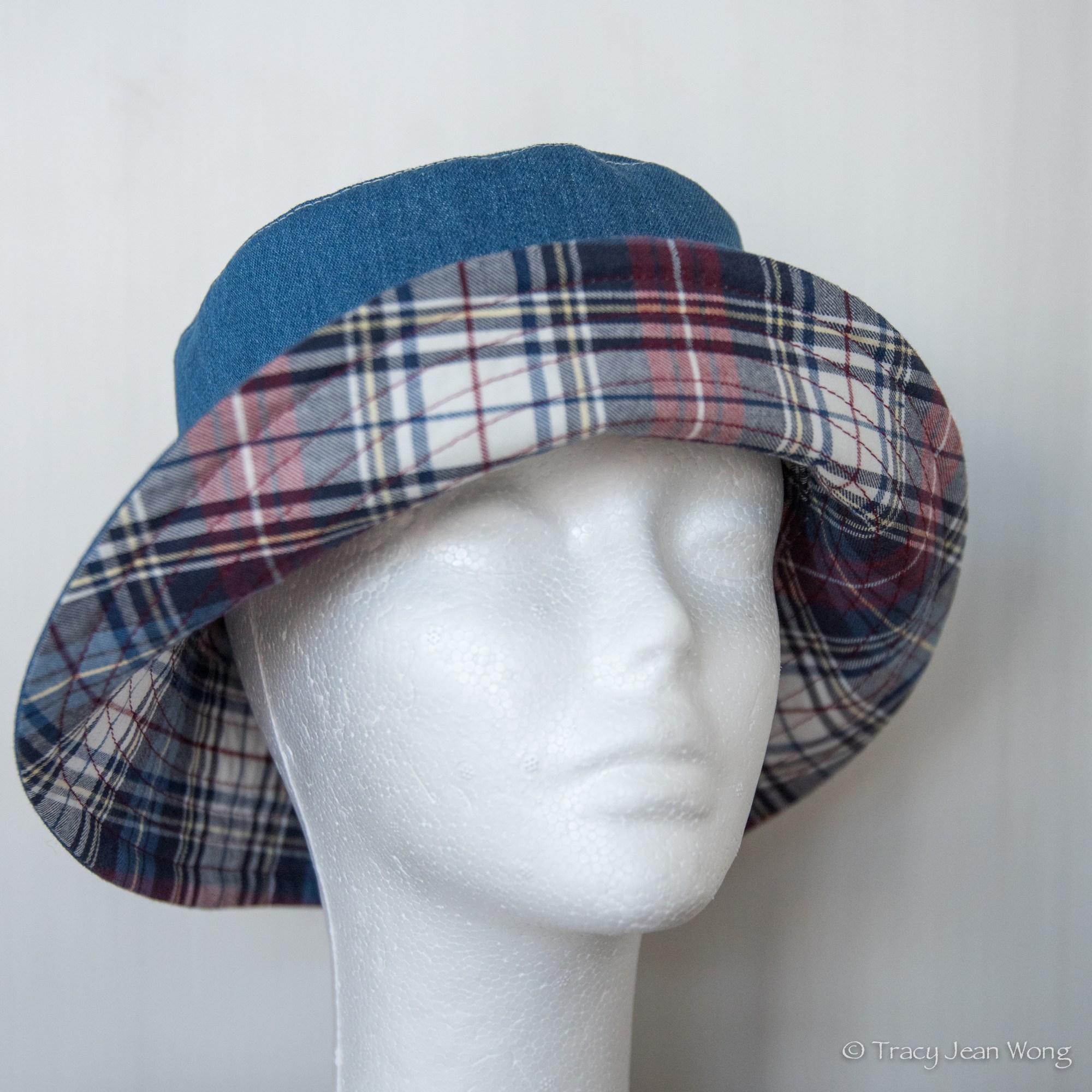 This hat was sewn from blue cotton denim and plaid Viyella (a washable cotton and wool blend) fabrics. From each piece of fabric, three pattern pieces were cut: a top, a crown, and a brim. Precision is required in cutting and sewing the pieces together for a proper fit and an attractive finished look. I chose to centre-align my favourite part of the plaid pattern and match the plaid on all three pieces as much as I could. The fabrics allowed me latitude in choosing contrasting colours of thread for the topstitching.