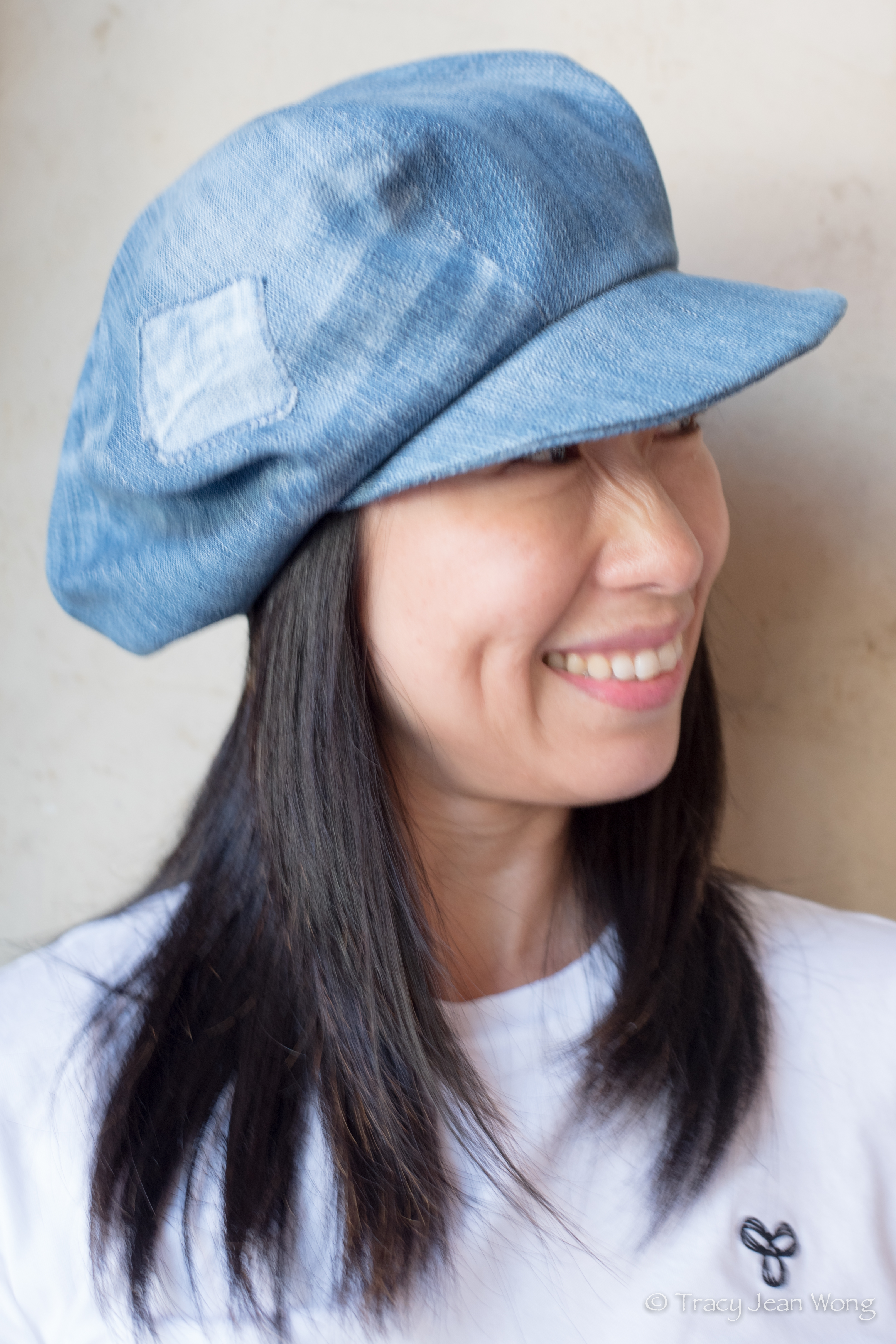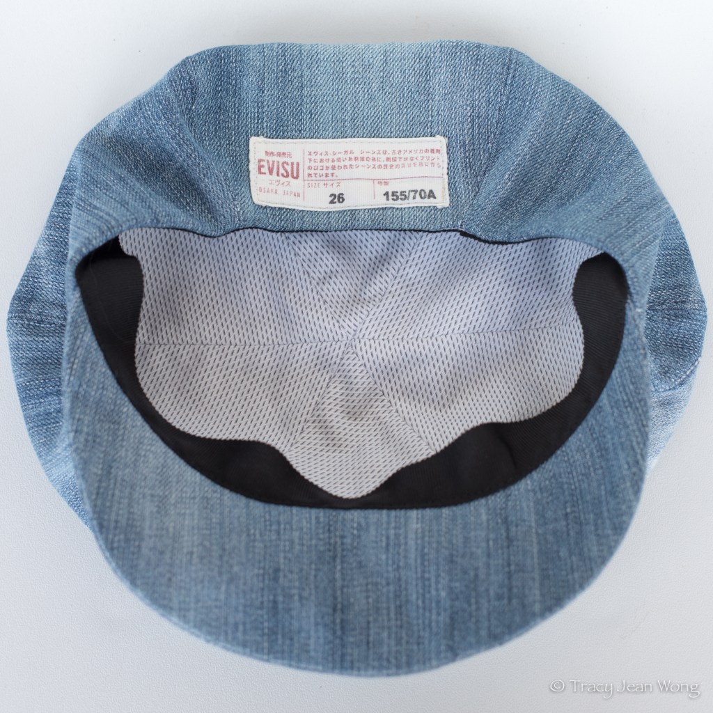 I chose to sew a newsboy cap because there isn’t too much fabric to these skinny jeans. The six triangular crown panels were cut from the legs and the visor from the hip area of the pants. The fabric is 99% cotton and 1% spandex. It was fun to consider the many options for highlighting the custom finishes of the jeans. I liked the way the rip had been treated and the patch. I also incorporated the label as a reminder of where this hat came from.
