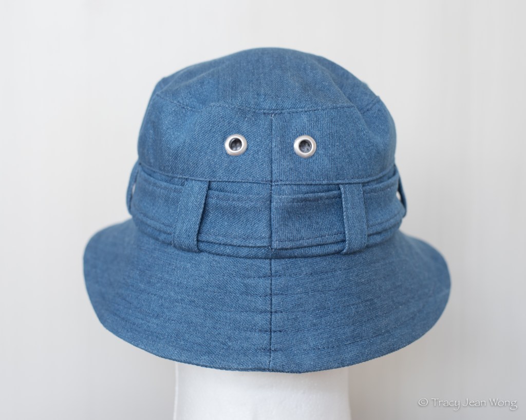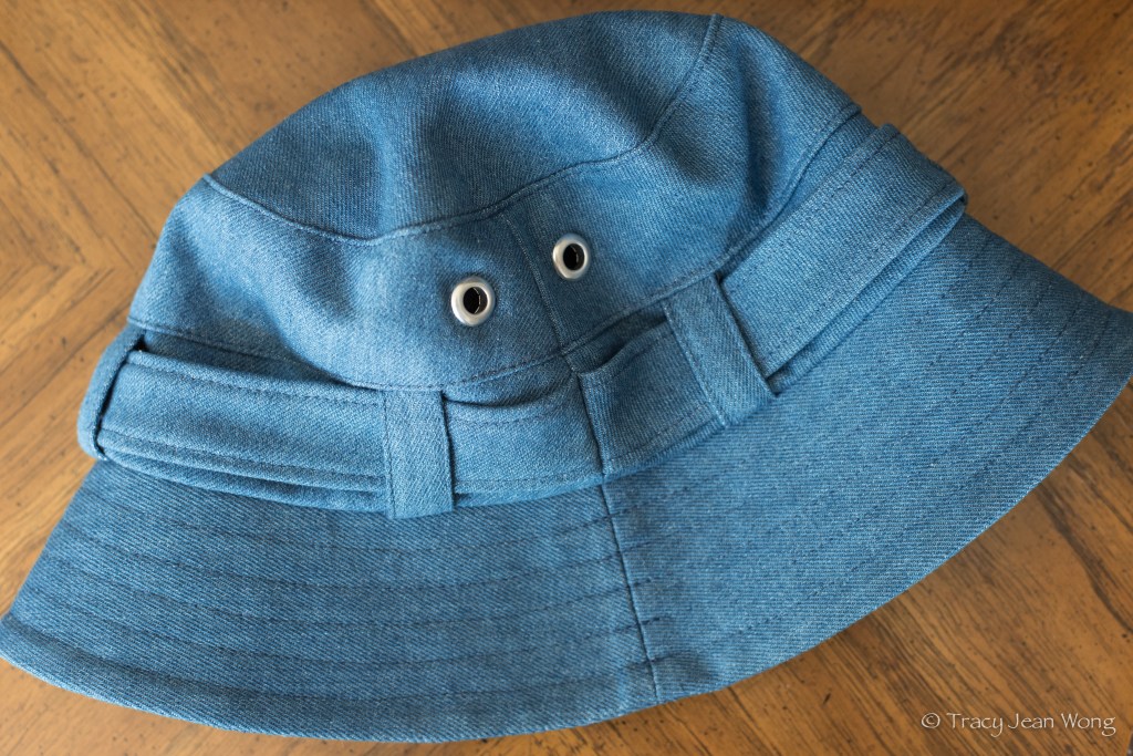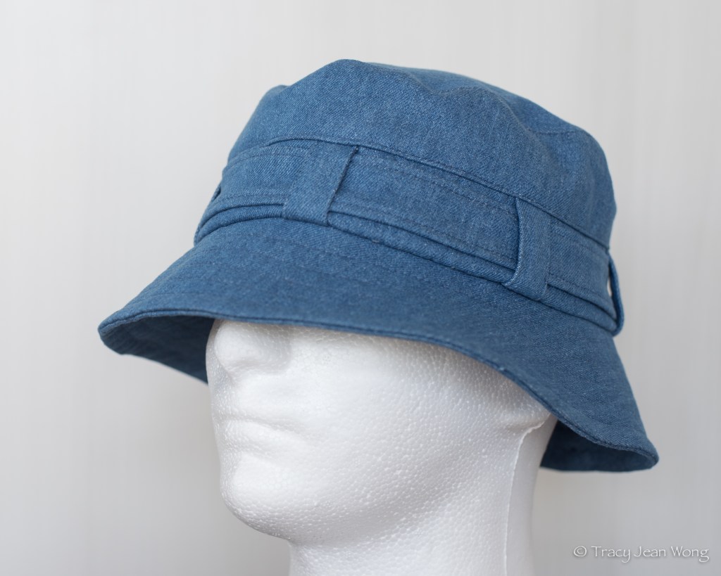 I thought, “Oh no, what a difficult task I have been given!” Nevertheless, with a positive attitude, I accepted photographs of the old bucket hat and a head measurement. I was able to purchase a piece of soft wash cotton denim. It will take time for sun-bleaching, laundering, and wearing to further soften and fade the fabric. I drafted pattern pieces for proper sizing and mimicked features of the treasured hat. I included the double-tiered side crown, belt-like band, belt loops, top stitching, and grommets.