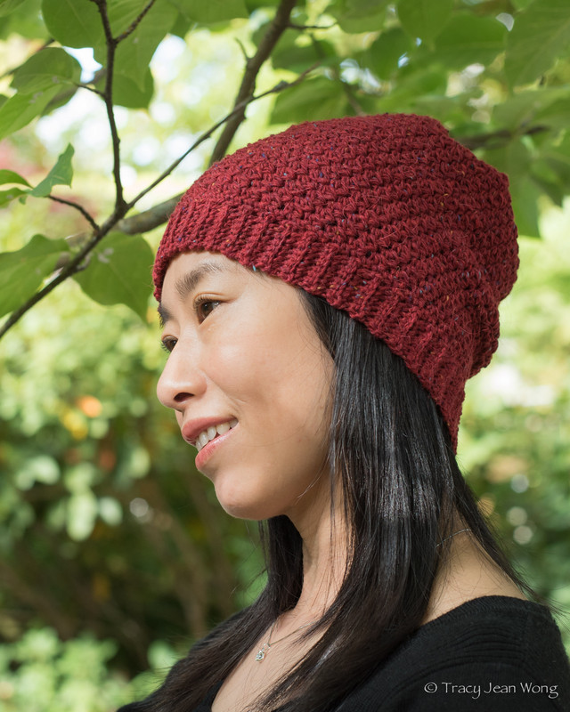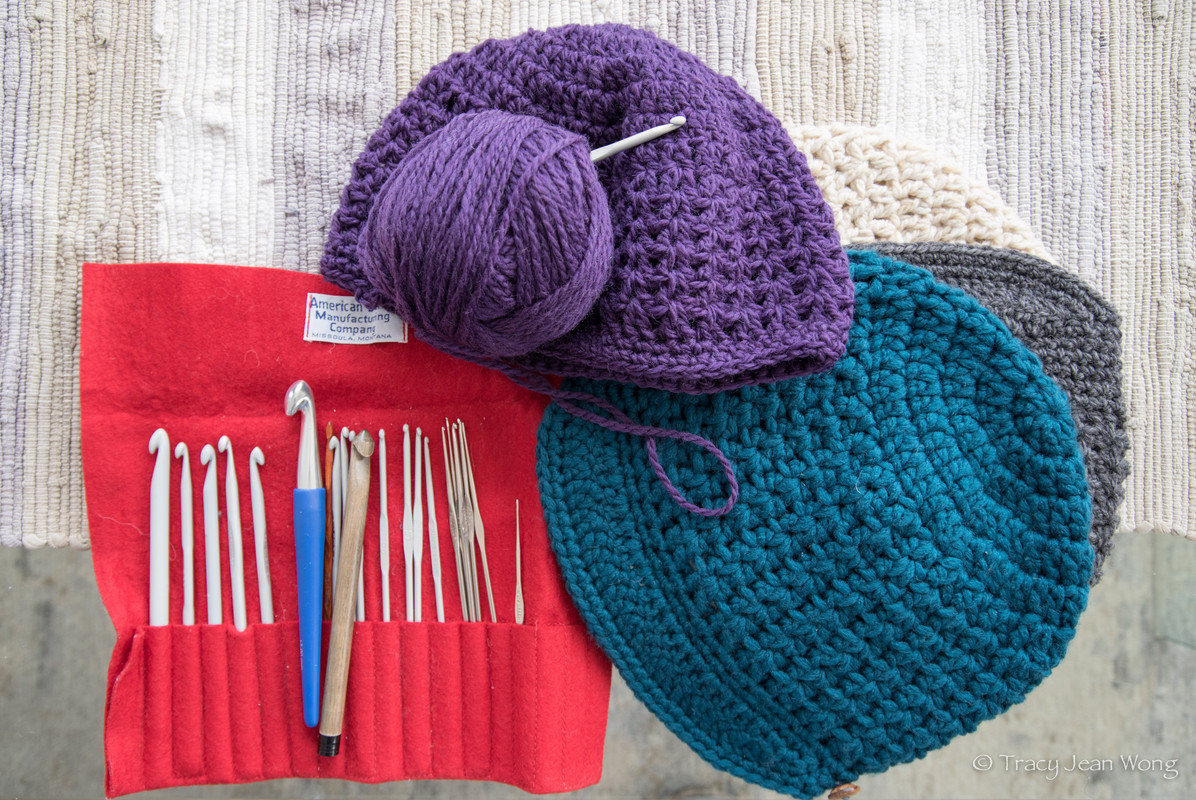 Embarking on a new crochet hat project is fun. Duplicating or tweaking the same hat pattern continues the adventure. Colour is an obvious way to change the look, as is the choice of yarn. Different yarns give hats different drape and structure. In the hats pictured above, Bluefaced Leicester wool and a wool/silk/cashmere blend were used to crochet beanies with a tailored look where the stitches are well defined but softness is maintained. Fibre thickness might dictate a change in crochet hook size. Having an assortment of hook sizes enables me to crochet test swatches and adjust the pattern accordingly.