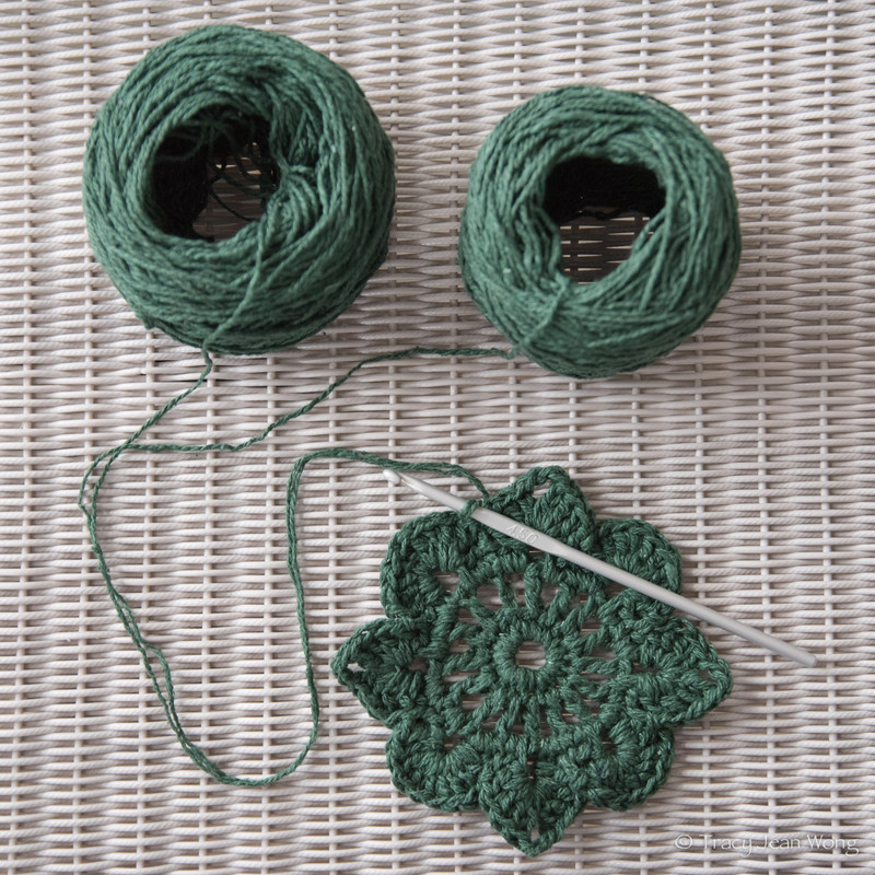The resulting yarn cakes make crocheting or knitting easier because they sit flat on a surface and let you pull yarn neatly from the centre of the cake. For my crochet squares hat, I used two strands of yarn held together to crochet five granny squares, joining them to make up a hat.
