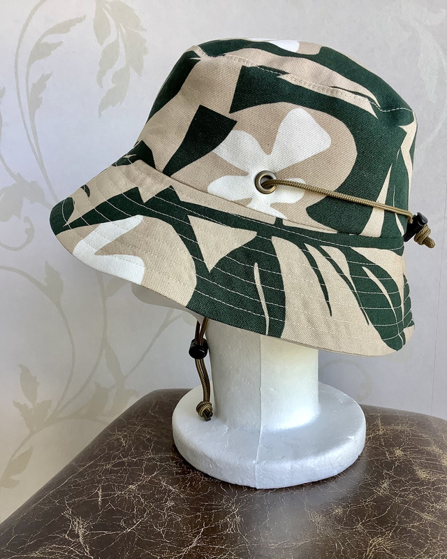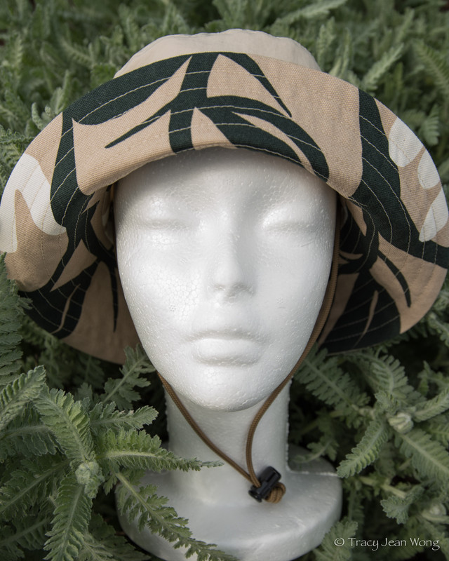 This hat was custom sewn for a woman who had been invited to a garden tour in her community. She wanted a hat fitting for the occasion, but that could also do double duty in her own garden. She chose an organic cotton print in green and cream on brown for the eye-catching side of the bucket hat and a practical water and wind-resistant technical fabric for the reverse. In addition, she requested a chin strap to prevent the hat from blowing off her head in her windy seaside garden.
