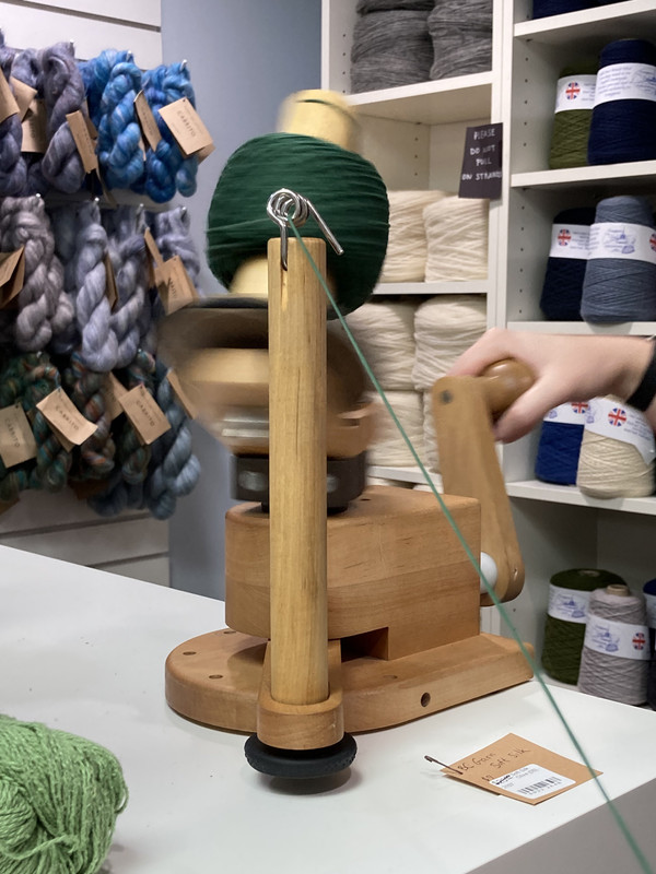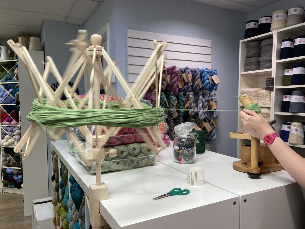 The yarn winder and a weight scale (on the floor, not pictured) are used to yield two equal-sized cakes of yarn.