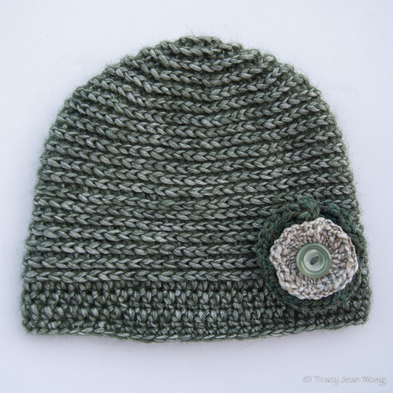 Technology touches aspects of modern living, including yarn development. A Peruvian yarn of “de-haired” alpaca and merino (shown below) is spun in a tube of silk webbing and does not pill. For this incredibly lightweight fibre, I used a hat pattern crocheted in the “third loop” of half double crochet stitches. It has ever so slight a brim, so I added a flower embellishment in two tones with a button.