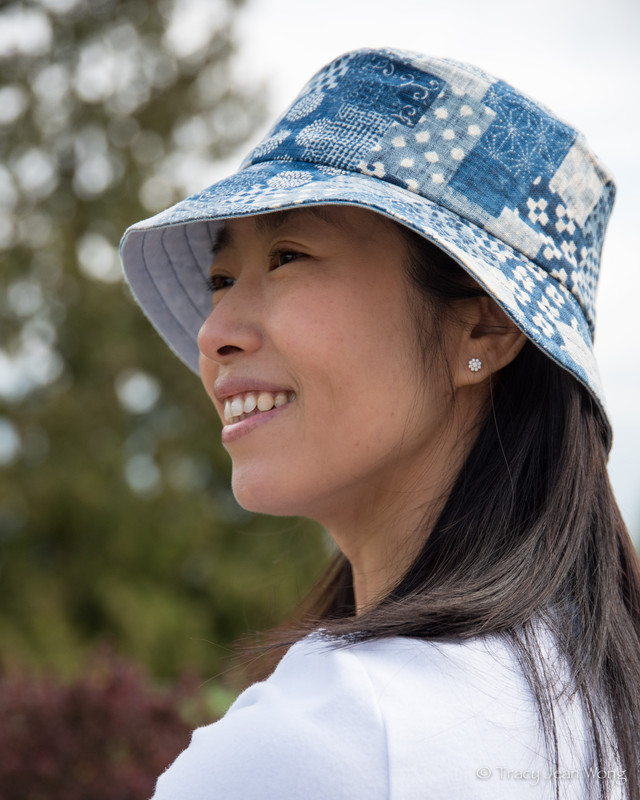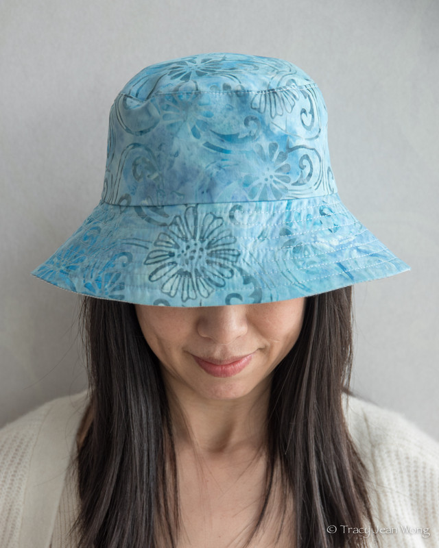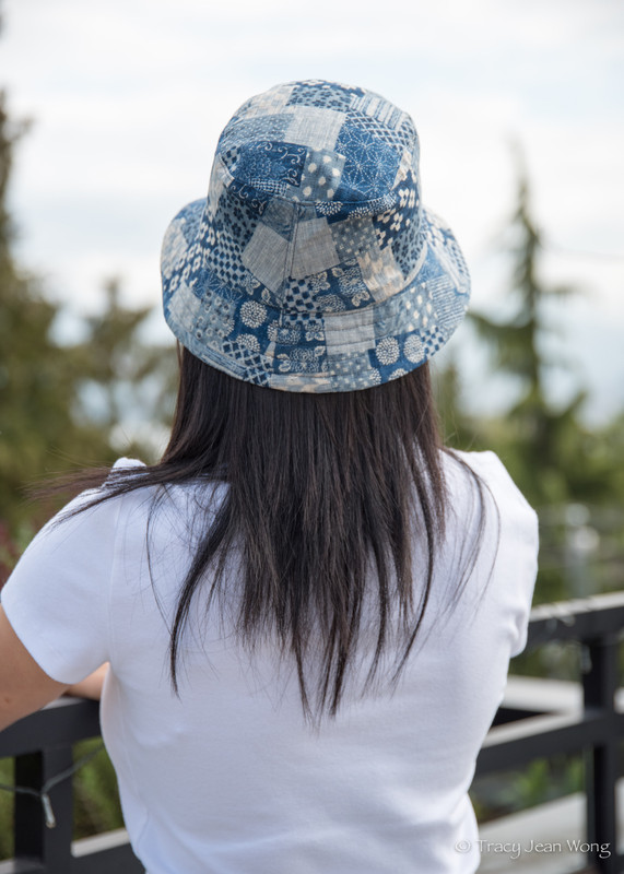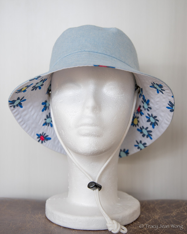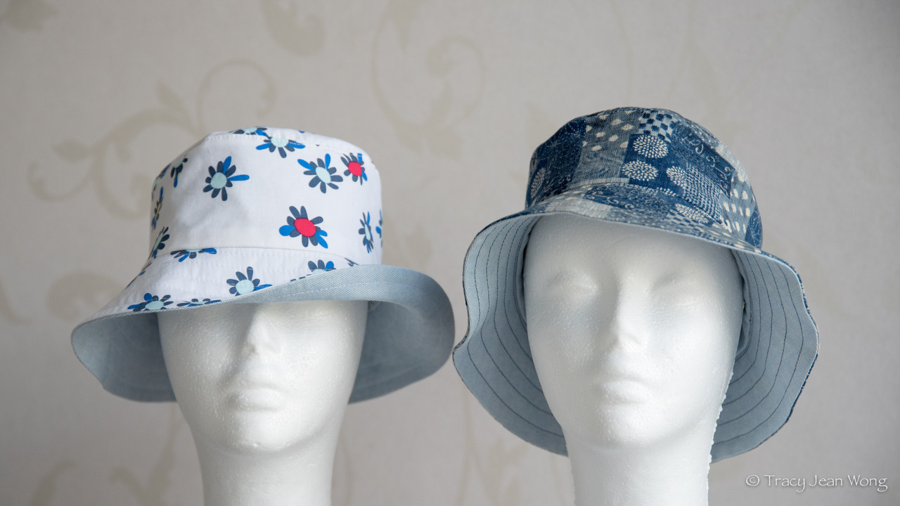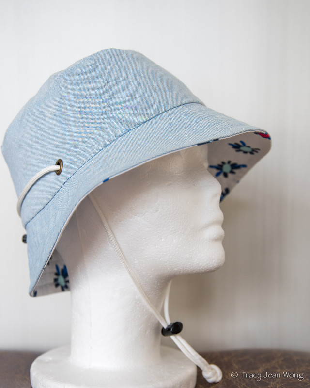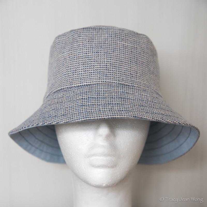 I purchased a light-weight quilting cotton with blue daisies and a medium-weight patchwork cotton from Sevenberry’s Nara Homespun collection. Both were made into reversible bucket hats and a remnant of blue recycled cotton canvas lined the reverse sides.