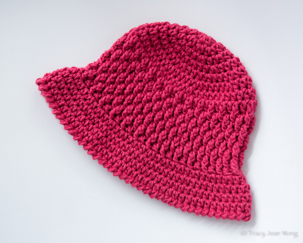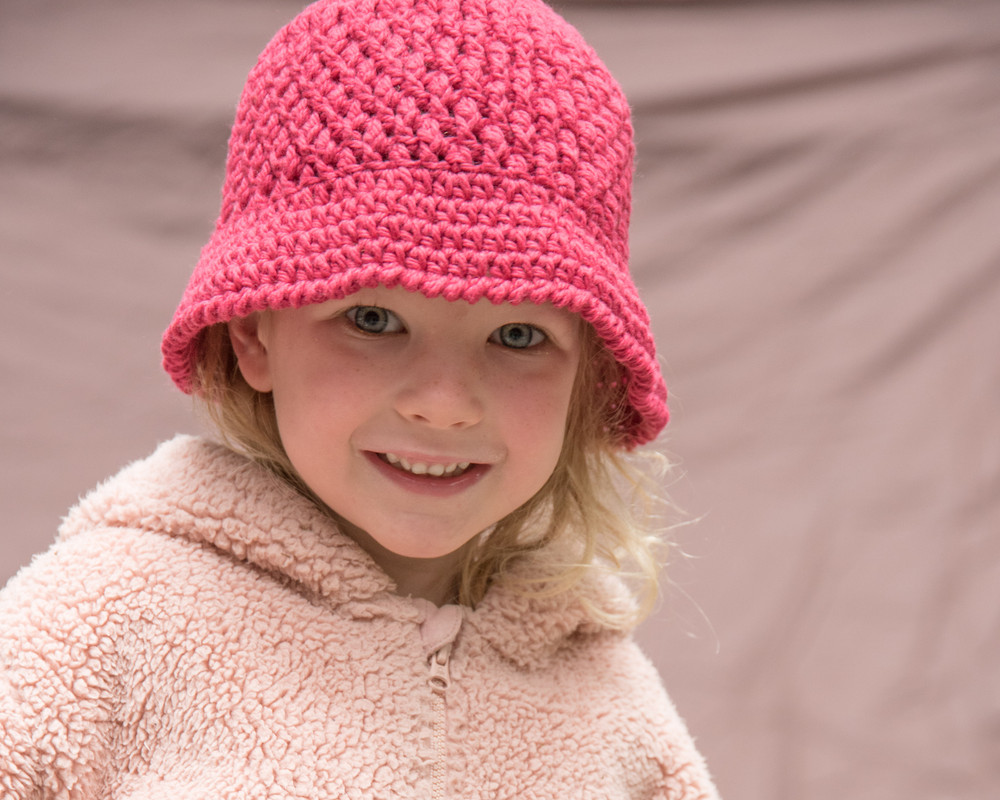 I chose to use a bright pink wool to crochet the girl’s brimmed Brickwork Hat. Pink is her favourite colour and she has many matching dresses, T-shirts, and hoodies in the same colour. A well-chosen chapeau can complete the look of an outfit at any age.
