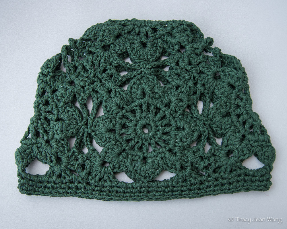 Crochet Squares Hat in olive, 100% silk, Yarnspirations design