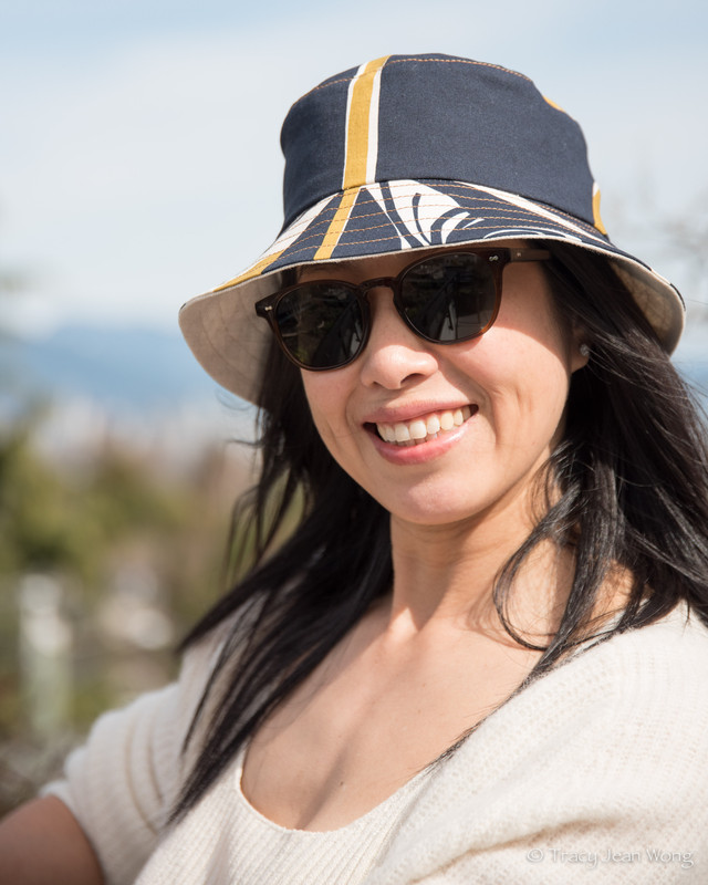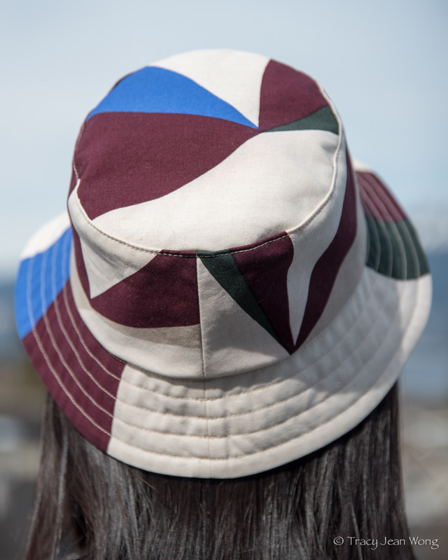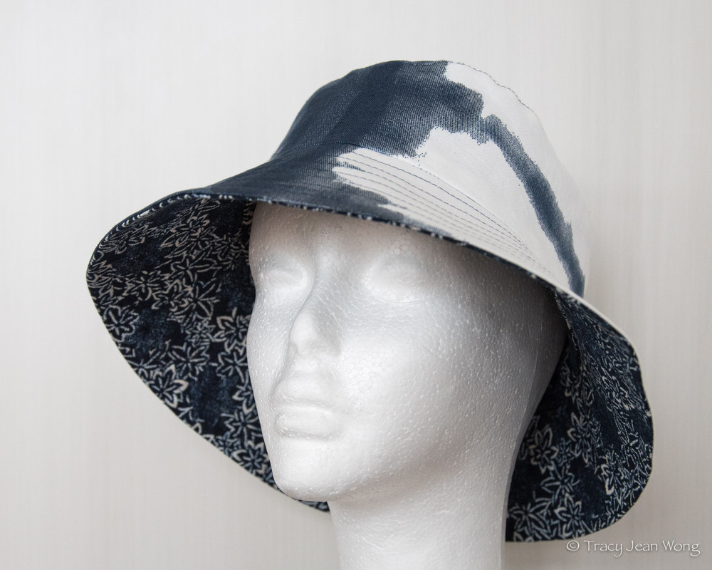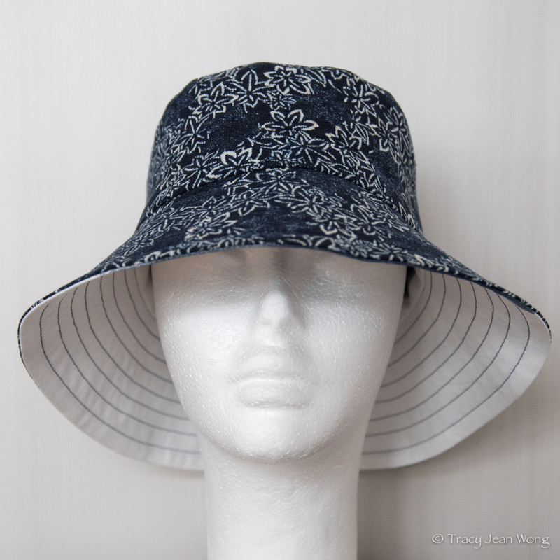 When Marimekko fabrics caught my eye, I wanted to incorporate some of the large abstract prints into hats. At first, as in the hat above, I opted for a cream-coloured fabric for a subtle other side of my reversible bucket. Feeling a bit more adventurous, for the next hat, I paired a checked navy and white cotton/hemp blend with an indigo-dyed cotton sheeting printed with maple leaves.