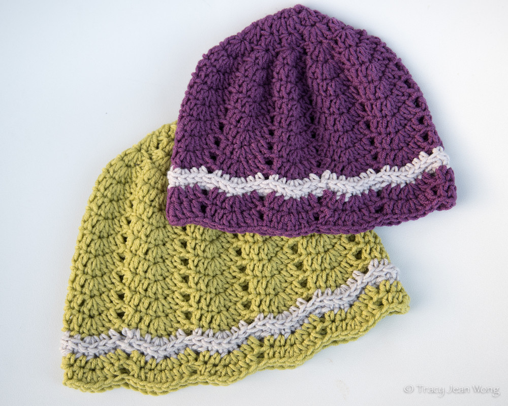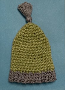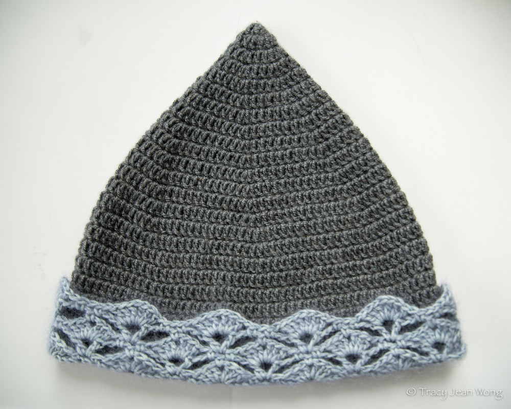 The elfin hat with its conical top is whimsical and playful. It may make you smile, conjuring up visions of ancient mythical creatures or Santa’s toy making helpers. Crocheted in a simple repeating pattern, this merino wool hat is trimmed with a feminine fan lace border.